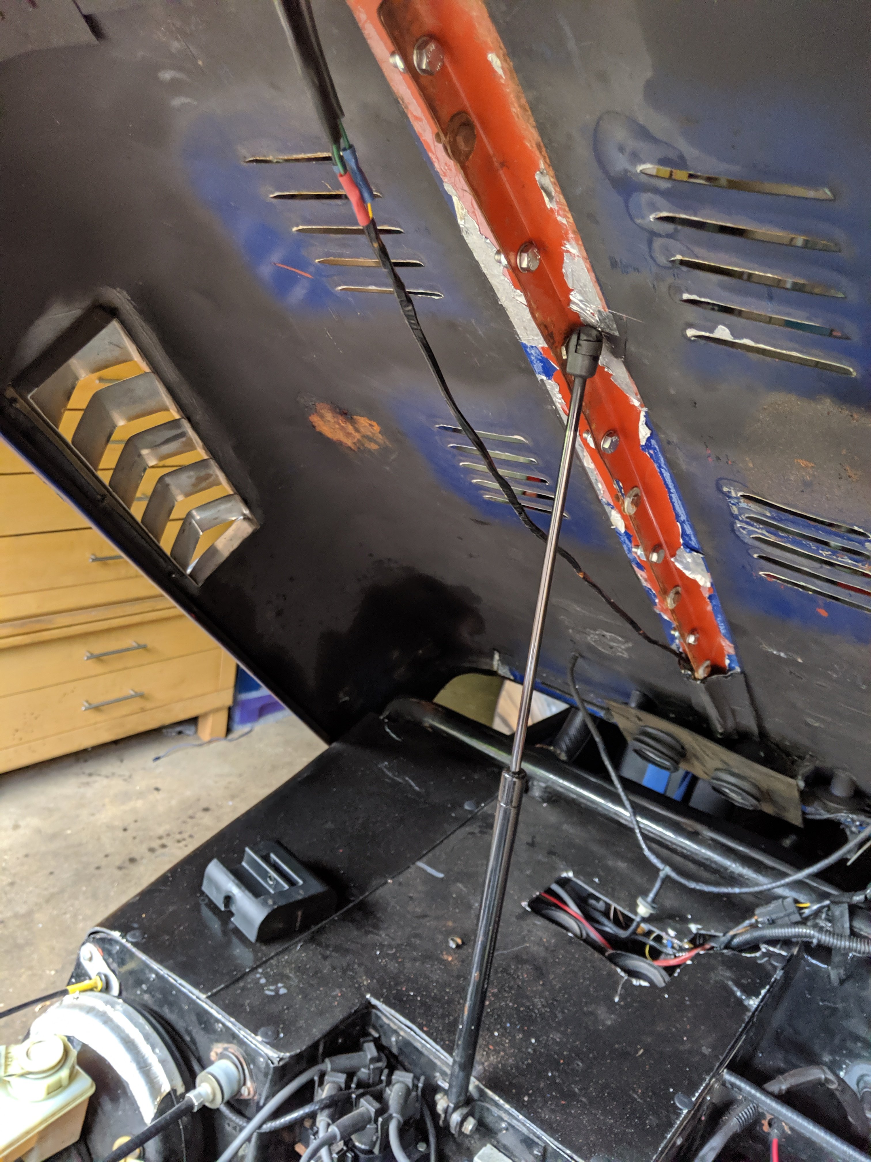 Now this would have been fine except for the fact that the builder then installed a long pneumatic ram (the type that opens a boot on a hatchback) to hold up the bonnet when you lift it. Great for convenience but done in such a way as to cause a long term issue.